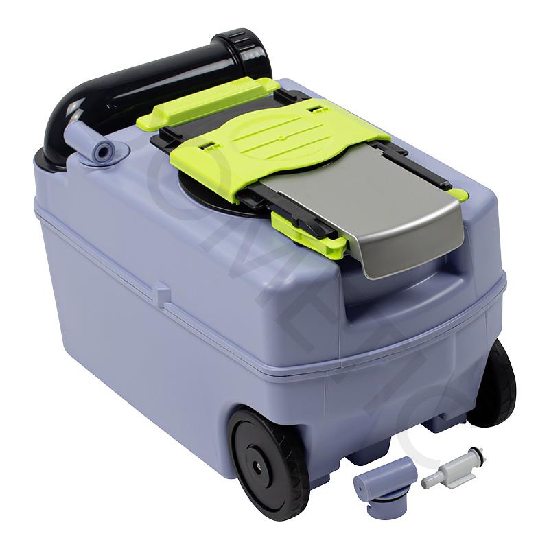 New caddy 19 litre tank with sturdy double-strut telescopic handle and large, easy-running wheels for convenient transport to the disposal area.